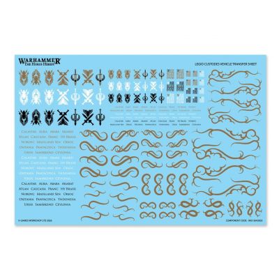 The Legio Custodes Vehicle Transfer Sheet features 210 high-quality waterslide transfers. These include Custodian symbols, text for locations of great battles, and more to decorate your miniature.