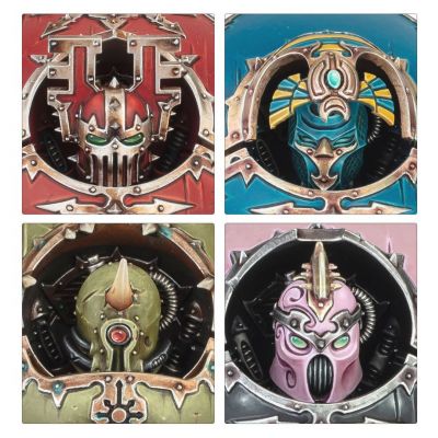 Your mighty walker is easy to customise – there are poseable legs, armour, and chest options, 3 sets of carapace armour, interchangeable exhaust pipes, 2 sets of shoulder pads, 2 sets of torso trim, and 3 pieces of rubble to help with posing. There are 10 face plates to choose from – one each for the Iron Warriors, Word Bearers, World Eaters, Thousand Sons, Emperor’s Children, and Death Guard, plus 4 others suitable for any Chaos Space Marines force.