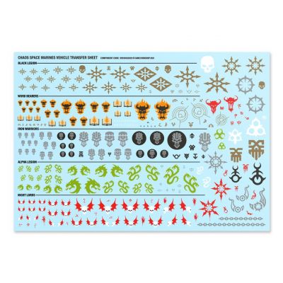 The Chaos Space Marines Vehicle Transfer Sheet features 282 high-quality waterslide transfers. These include Black Legion, Word Bearers, Alpha Legion, Night Lords, and Iron Warriors symbols, along with other Chaos markings to decorate your miniature.