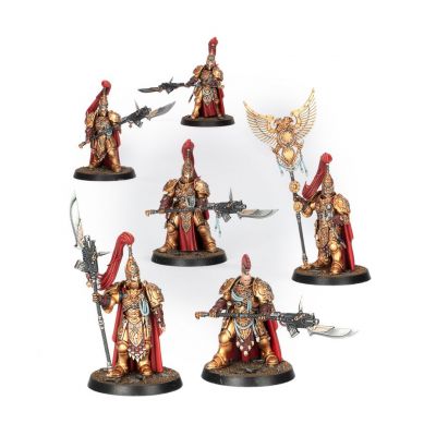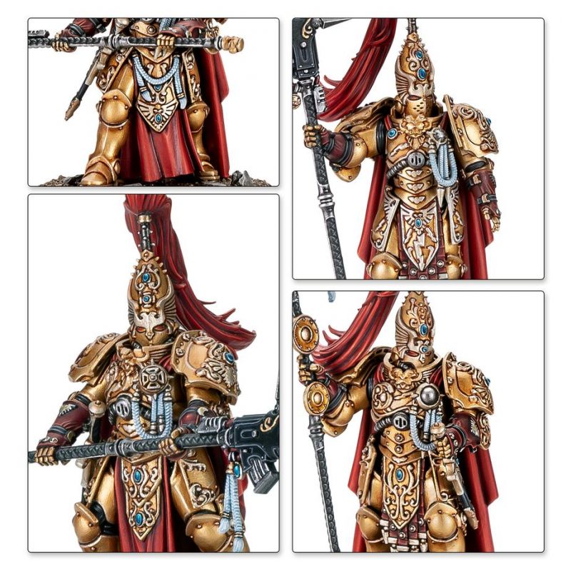 Each Custodian Guard is lavished in details, including sculpted iconography and filigree, giving them the ornate appearance you’d expect from the Emperor’s bodyguards. One of the Custodian Guards can optionally replace their guardian spear with a magisterium vexilla. The kit also includes 23 interchangeable heads – 12 helmeted and 11 bare – and 6 plumes that are interchangeable across the helmets, making it easy to customise your legendary warriors.