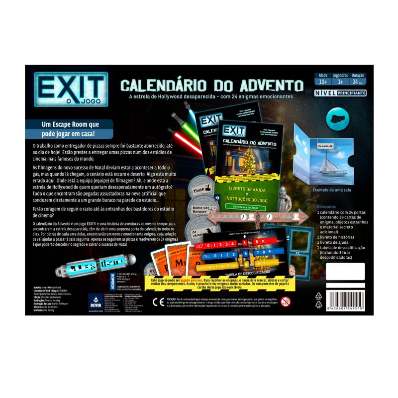 O trabalho como entregador de pizzas sempre foi bastante aborrecido, até ao dia de hoje! Estão prestes a entregar umas pizzas num dos estúdios de cinema mais famosos do mundo. Terão coragem de seguir o rasto até às entranhas dos bastidores do estúdio de cinema? O calendário do Advento é um jogo EXIT e uma história de aventuras ao mesmo tempo: para encontrarem a estrela desaparecida, têm de abrir uma pequena porta do calendário todos os dias. Por detrás de cada uma delas, encontrarão um novo e emocionante enigma, cuja solução os vai ajudar a passar à sala seguinte. Apenas se seguirem as pistas e resolverem os 24 enigmas é que poderão descobrir o segredo e salvar o sucesso de Natal.