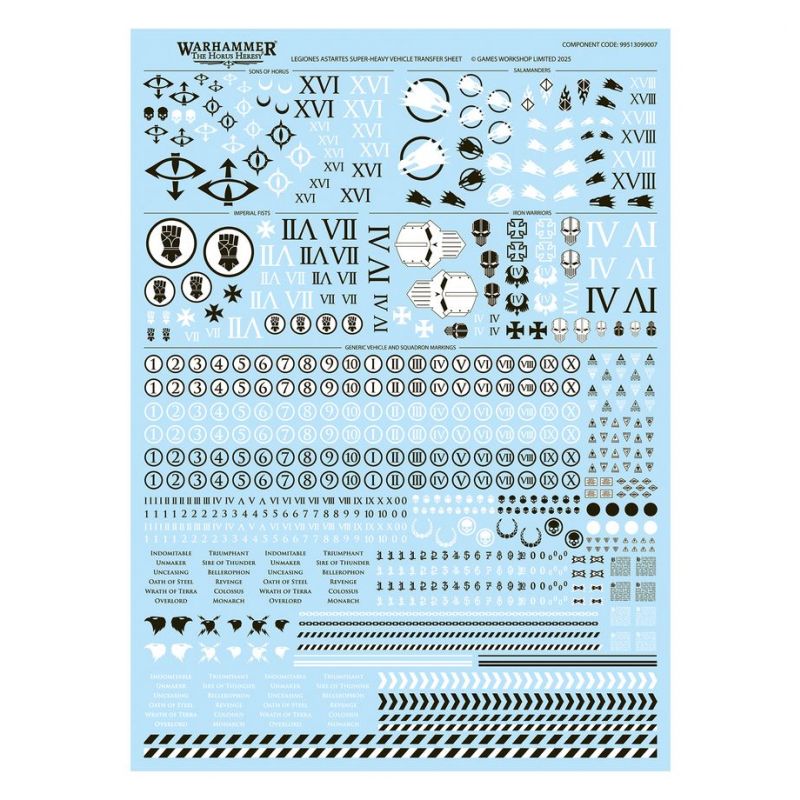 This kit is supplied with a Legiones Astartes Super-Heavy Vehicle Transfer Sheet that contains 718 high-quality waterslide transfers. These include Imperial Fists, Sons of Horus, Salamanders, and Iron Warriors icons, plus numbers and other markings to decorate your tank.