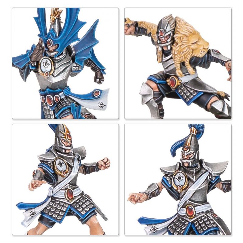 Four of the High Elf Linemen each have 2 head and plume options, and the other two have plume options. Both White Lions have 2 head options and 2 left arm options. The Dragon Princes each have 2 mask options and 2 right arm options.
