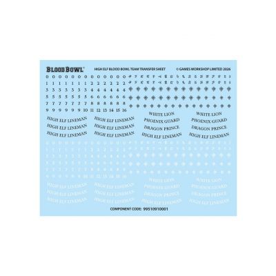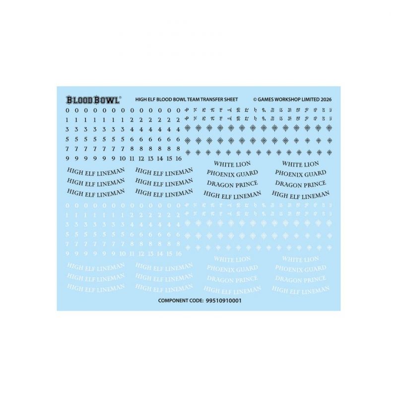 The High Elf Blood Bowl Team Transfer Sheet features 342 high-quality waterslide transfers. These include Caledor Dragons symbols, other High Elf icons, position names, and numbers to decorate your miniatures.