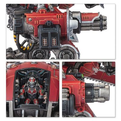 There are 2 straightforward poses for the legs, and an advanced option for more experienced Warhammer hobbyists. The kit includes 3 different face masks, and the hatch can be built closed or open, showing off the detailed interior and pilot. It can be armed with either a multi-barrelled heavy calibre chastiser gatling cannon to sweep aside infantry, or an explosive shell-firing frag bombard. To accompany this is an oversized rocket-assisted thundershock spear to punch clean through reinforced armour, or a versatile reaper chainsword to scythe through hordes or gut monstrous creatures with a single blow. These weapons can be mounted on either arm, making it easy to customise your devastating war machine, and the thundershock spear has 2 assembly options.