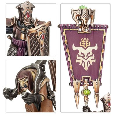 The kit includes parts to build an optional champion with a choice of two heads, armed with either a two-handed axe or a hammer and shield. The optional standard bearer has three head options and three banner toppers. The optional musician is accompanied by a Hobgrot who has a choice of two heads. The shields and left arms are interchangeable across the miniatures, making it easy to customise your disciplined and ruthless warriors.