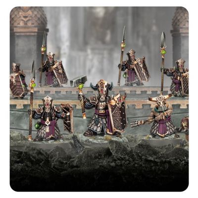 Infernal Cohorts form the black heart of the Zharrdron warhosts. Drawn mainly from the stock of the royal clans, the finery these duardin clad themselves in does not detract from their pitiless martial skill. Their regiments take to battle wielding blades or spears ablaze with daemonic energy, forming a wall that advances to the sound of arcane gongs and grinds down the foe without mercy.