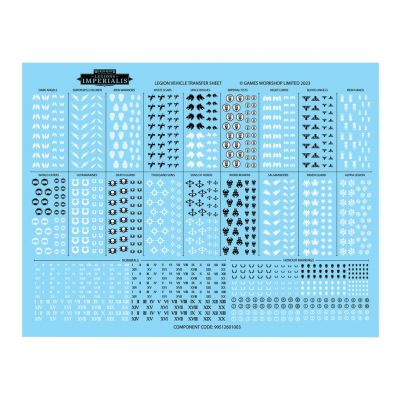 This kit is supplied with 1x Legion Vehicle Transfer Sheet, containing 1,130 high-quality waterslide transfers to decorate your miniatures. There are icons for each of the 18 Legions in the Horus Heresy, along with numerals and honour markings.