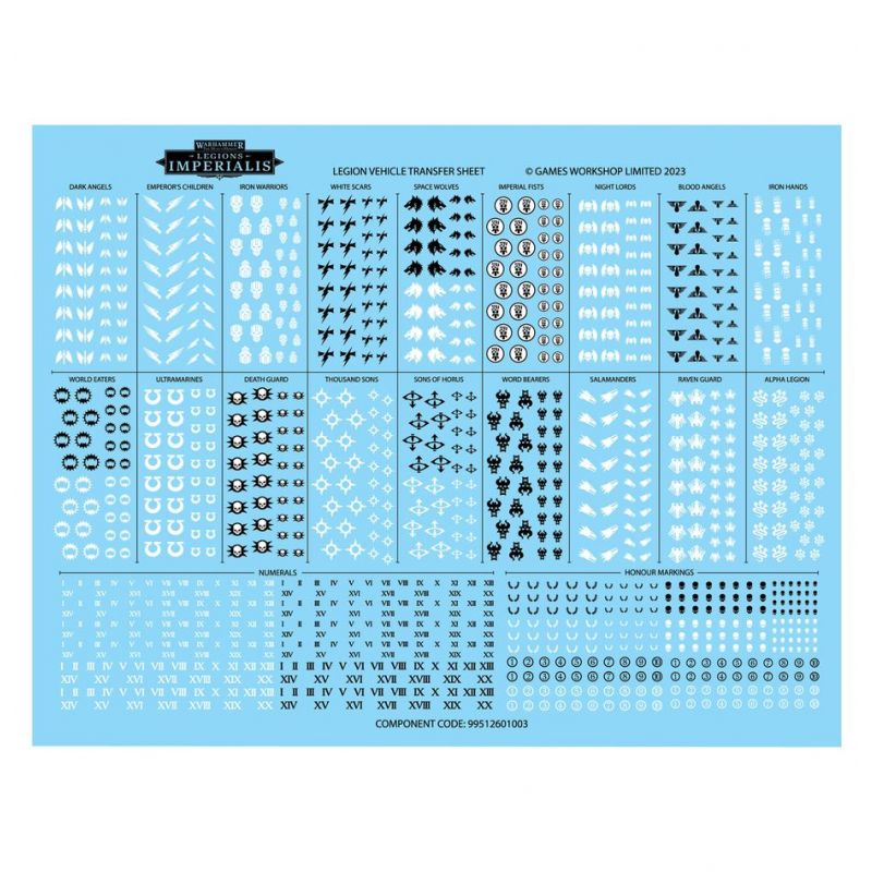 The kit also comes with 3x Legion Vehicle Transfer Sheets, each containing 1,130x high-quality waterslide transfers, including markings for all 18 Legions, numerals, and honour markings.