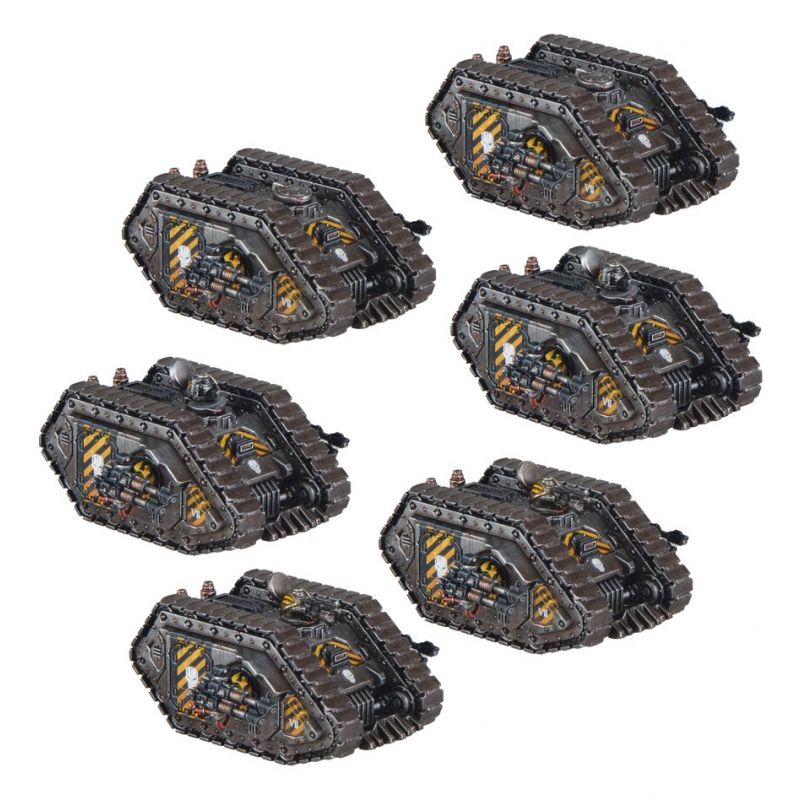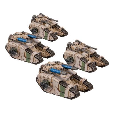 The Support Legionaries build two with plasma guns and two with missile launchers. The Contemptor Dreadnoughts build two with Kheres assault cannons and two with twin-linked lascannon. The Leviathan Dreadnoughts build two with Leviathan storm cannons and two with cyclonic melta lances. The Deredeo Dreadnoughts build two with Anvilus autocannon batteries and two with hellfire plasma cannonades. The Rapiers build two with quad launchers and two with laser destroyer arrays. The Tarantulas build two with Hyperios air-defence missile launchers and two with lascannon batteries. The Sicaran Tanks can each be built as Sicaran Arcus or Sicaran Punishers.