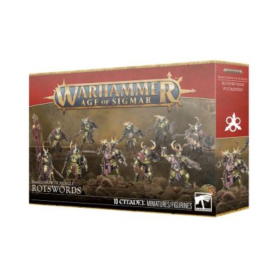 This multipart plastic kit builds 10 Rotswords, heavily armoured mortal infantry for your Maggotkin of Nurgle armies in games of Warhammer Age of Sigmar. Clad in thick plates of rusting metal, they are difficult to take down, making them especially effective at holding objectives. Each Rotsword can be equipped with a pair of deadly, ruined master-crafted weapons or a weapon and a shield. The right-handed weapons and left-handed shields are interchangeable across the miniatures, as are the 12 heads in the kit, making it easy to customise your unit. There are also parts to build an optional champion, musician, and standard bearer with a choice of two banner toppers.