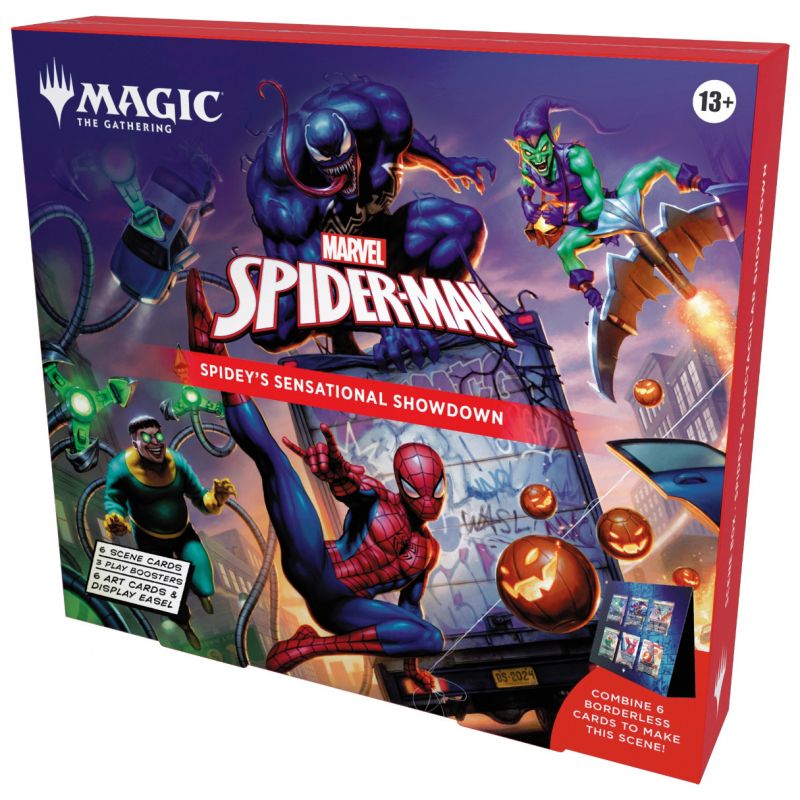 Immortalize an iconic moment with the Marvel's Spider-Man Scene Box. Power up your deck or collection with these six Borderless Scene cards and piece them together to reveal the full story. A devious ambush adds triple the trouble for Spider-Man! Can he save the city and still make it to date night with MJ?