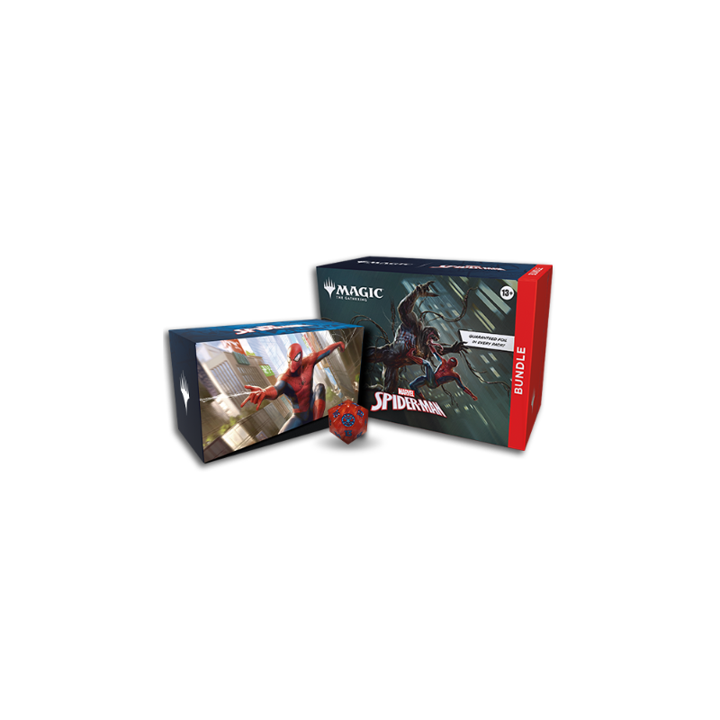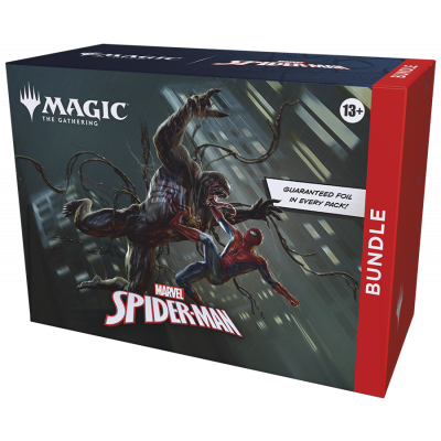 This Bundle contains 9 Magic: The Gathering | Marvel’s Spider-Man Play Boosters (each containing 14 cards), 1 Traditional Foil alternate-art promo card, 15 Traditional Foil Basic Land cards (including 5 with Full Art), 15 nonfoil Basic Land cards (5 with Full Art), 1 oversized Spindown life counter, 1 card storage box, and 2 reference cards.