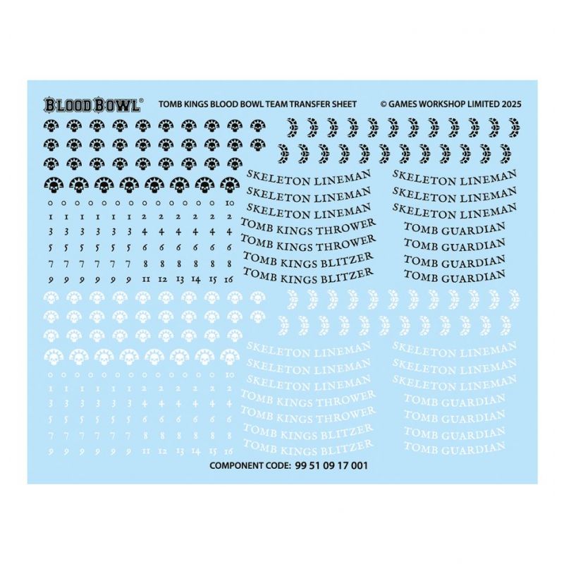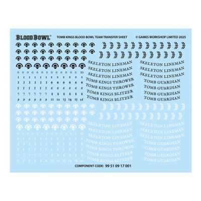 This kit is supplied with a Tomb Kings Blood Bowl Team Transfer Sheet, featuring 298 high-quality waterslide transfers. These include Tomb Kings icons, decorative elements, role identifications, and numbers for you to decorate your miniatures.