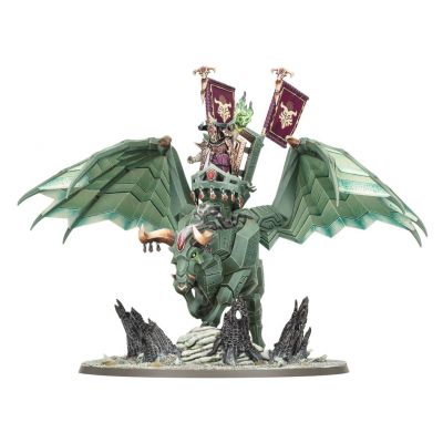 This multipart plastic kit builds Urak Taar, mounted on his Infernal Taurus, Ghorrakos. As the first and greatest Daemonsmith, he is the ultimate leader for your Helsmiths of Hashut armies in games of Warhammer Age of Sigmar. Urak Taar is an absolute terror on the battlefield, lashing out with spells even while his mount grinds his foes into the earth under its metal hooves and gores them with long horns. Standing at 144mm tall with a wingspan of 193mm, this darkly majestic miniature towers over your army. As well as dominating on the tabletop, its stunning details, including stone-cursed flesh, runes, and gems, make for a true test of your painting skills. Taar can be assembled with or without ruinous torrents on his staff.