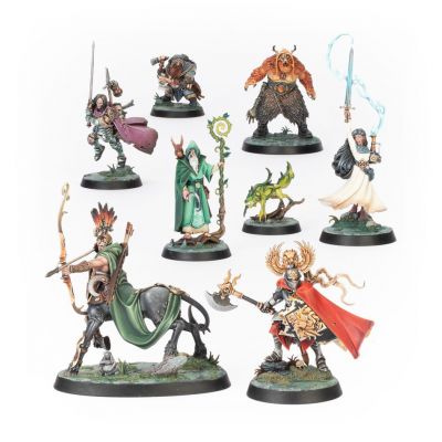 – 7x hero miniatures, and 1x companion, cast in khaki plastic: Edmark Valoran, Bren Tylis, Inara Sion, Drolf Ironhead, Kelthannor, Drasher Vorn, and Jacobus Vyne with Wisper