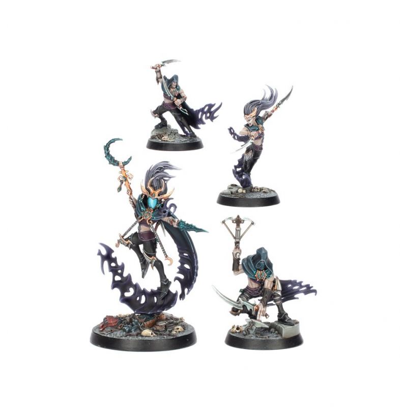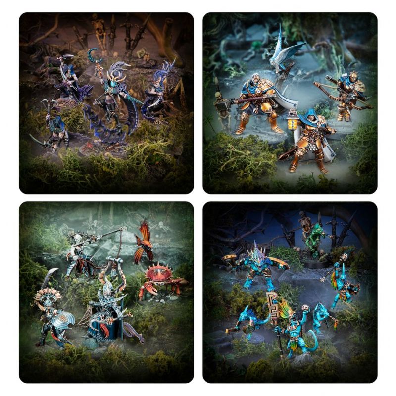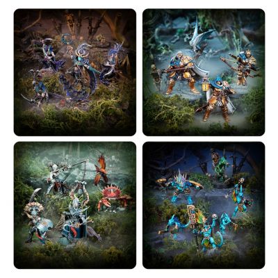 This kit collects four Order-themed warbands for Warhammer Underworlds. All the miniatures are push-fit, moulded in coloured plastic, and include scenic bases on the frames so you can start playing quickly. You'll also find warscroll cards and fighter cards for each warband. The Shadeborn are an aggressive Strike warband, Xandire's Truthseekers are a versatile Flex warband, The Starblood Stalkers are a tough Take and Hold warband, and Elathain's Soulraid features the Mastery playstyle, which rewards players for careful management.